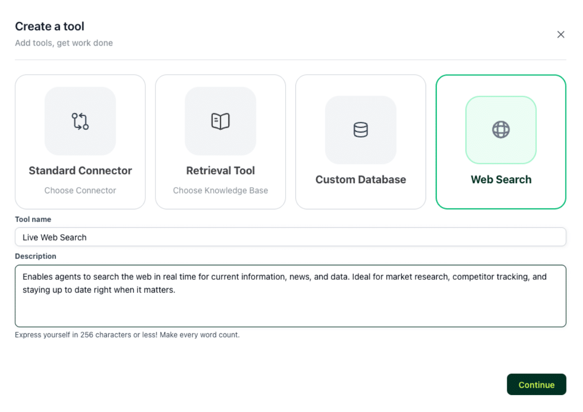 Mit Web Search können Ihre Agenten live Inhalte aus festgelegten Domains abrufen und direkt in ihre Antwort einbinden. Die Abfrage passiert in Echtzeit, ohne dass Webseiten vorab gespeichert werden müssen. Interne Wissensbasis-Ergebnisse und Live-Webinhalte fließen in einer einzigen, zitierten Antwort zusammen. Pro Tool können bis zu 10 Domains konfiguriert werden. Ihr Agent bleibt damit die einzige Anlaufstelle, auch wenn relevante Informationen über verschiedene Quellen verteilt sind.