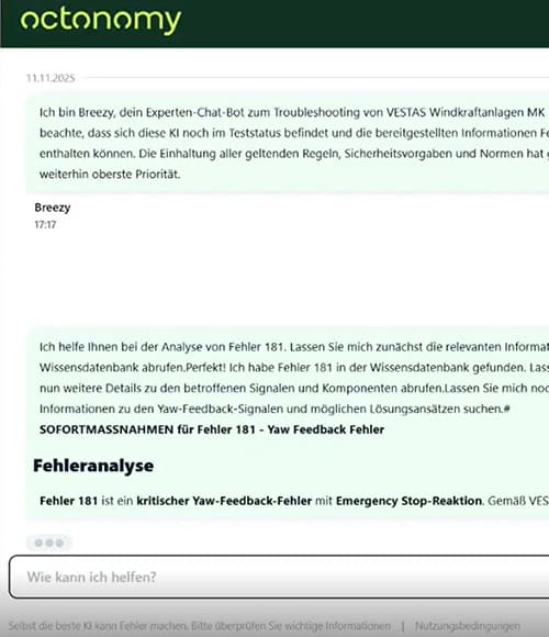 Der KI-Agent grenzt den Fehler ein, leitet Sofortmaßnahmen ab, liefert Diagnose-Schritte, schlägt benötigte Ersatzteile vor und weist auf sicherheitskritische Punkte hin.