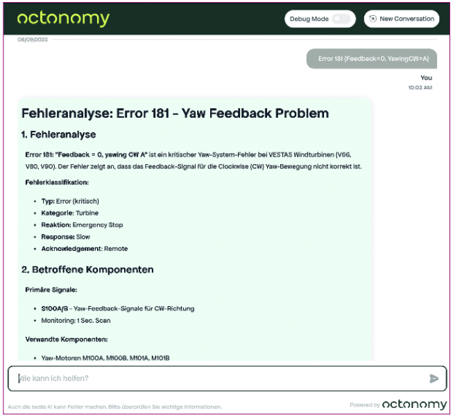Die Lösung? Ein KI-basierter Assistent, der Servicetechnikern in Echtzeit bei komplexen Troubleshooting-Aufgaben hilft. Statt stundenlang in Handbüchern zu suchen, erhalten Techniker präzise Fehlerdiagnosen – etwa bei einem „Error 181 – Yaw Feedback Problem“ mit detaillierten Lösungsschritten und betroffenen Komponenten.